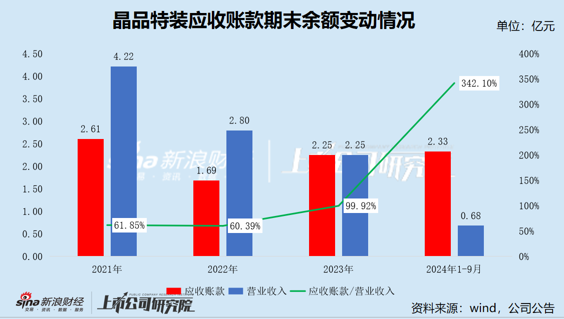 2022年、2023年、2024年1-9月,晶品特装应收款项(含应收账款、应收票据、应收款项融资、预付款项)期末余额分别为2.31亿元、2.42亿元和2.53亿元,占当期营业收入的比例分别为82.47%、107.28%和370.70%,呈现逐年上升趋势;应收账款周转天数分别为276.65天、314.74天和907.87天,呈现逐年增长趋势。