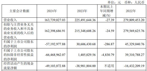 2024年,晶品特装实现营业收入1.64亿元,同比下降27.39%;实现归属于上市公司股东的净利润-0.57亿元,上年为0.31亿元;实现归属于上市公司股东的扣除非经常性损益的净利润-0.66亿元,上年为0.01亿元;经营活动产生的现金流量净额为-0.49亿元,上年为-0.39亿元。