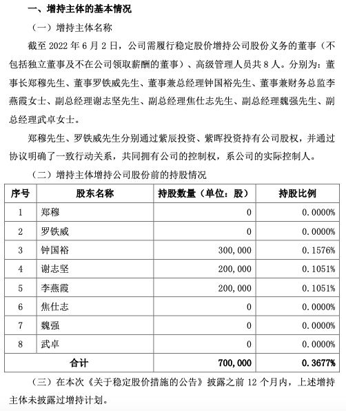 此次履行稳定股价增持公司股份义务的董事(不包括独立董事及不在公司领取薪酬的董事)、高级管理人员共8人。分别为:董事长郑穆、董事罗铁威、董事兼总经理钟国裕、董事兼财务总监李燕霞、副总经理谢志坚、副总经理焦仕志、副总经理魏强、副总经理武卓。郑穆、罗铁威分别通过紫辰投资、紫晖投资持有公司股权,并通过协议明确了一致行动关系,共同拥有公司的控制权,系公司的实际控制人。