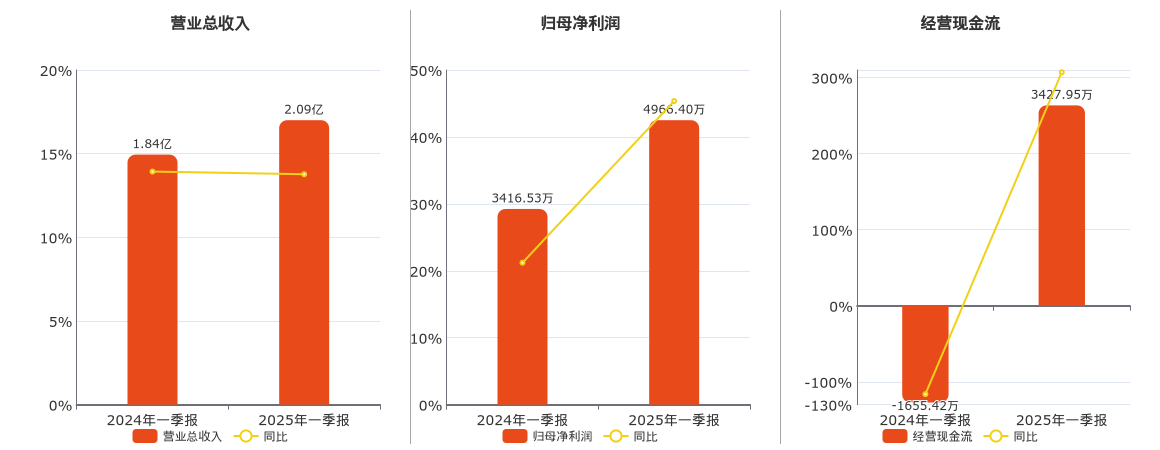 公司营业总收入为2.09亿元。归母净利润为4966.40万元。经营活动现金净流入为3427.95万元。