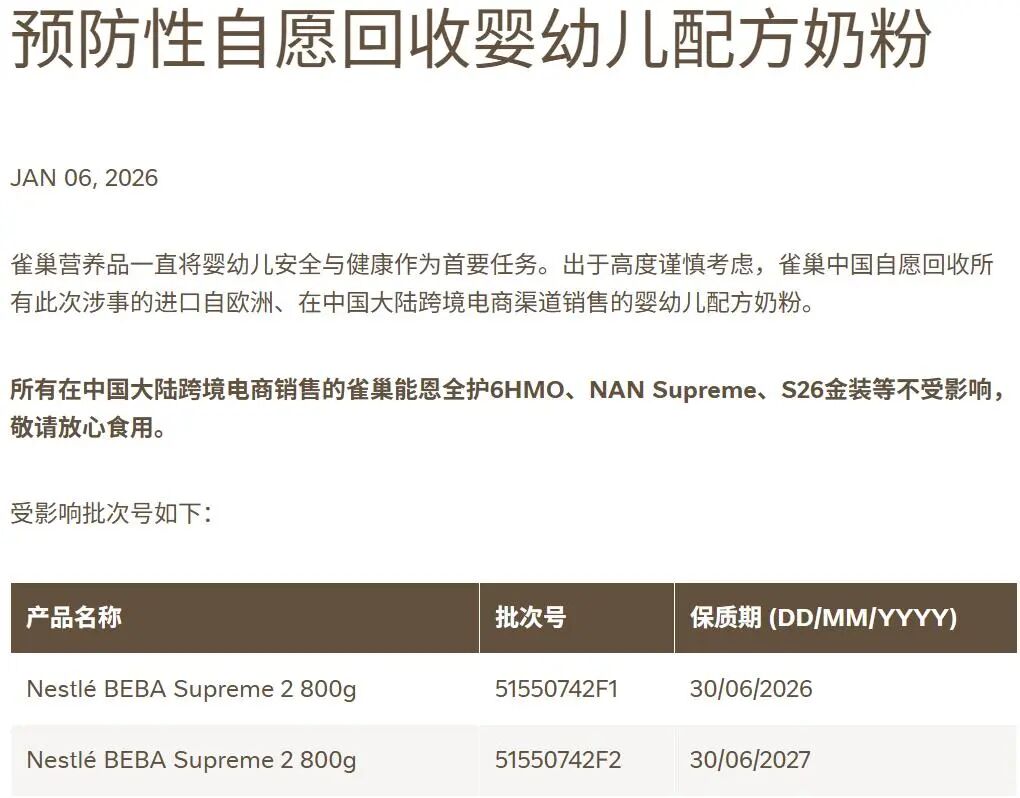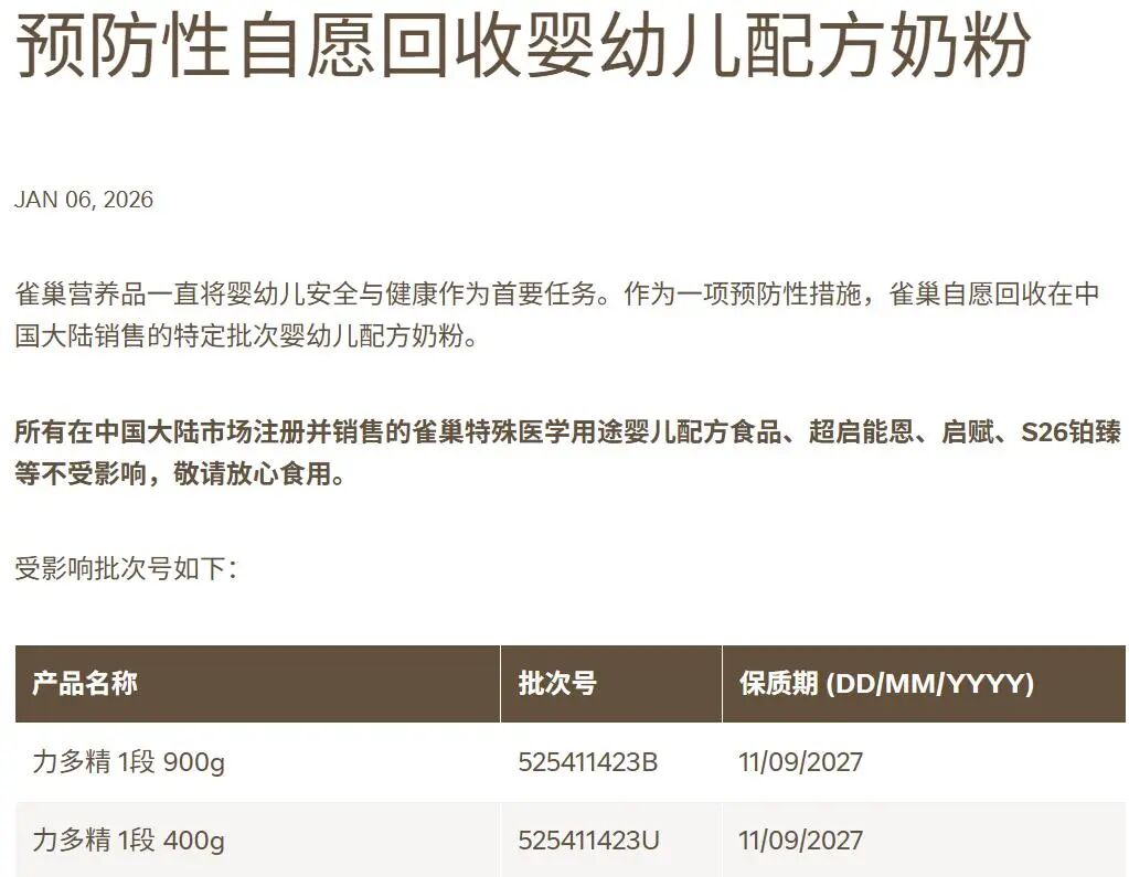 同时,对“力多精”“铂初能恩”等30批次在中国大陆市场销售的特定批次婴幼儿配方奶粉(含1款儿童奶粉)进行回收。