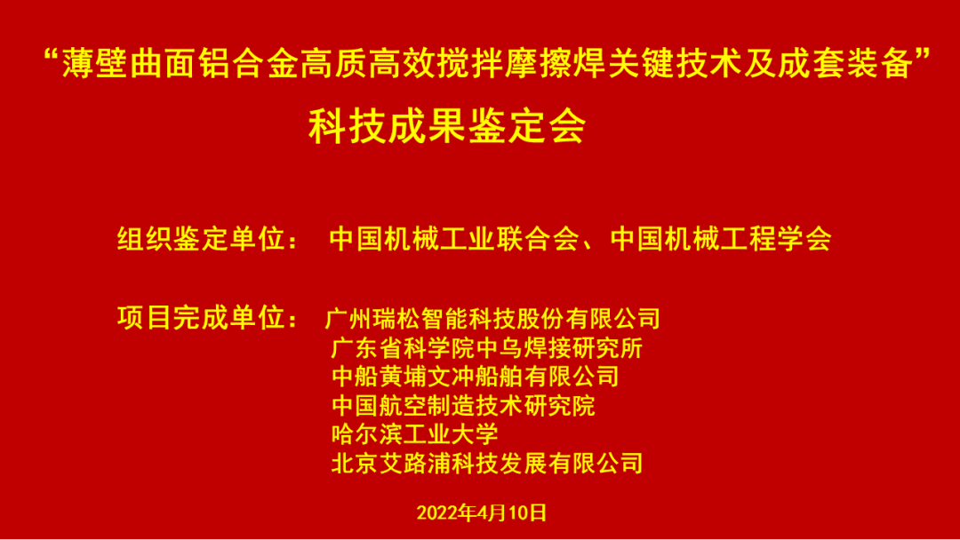 2022年4月10日,“薄壁曲面铝合金高质高效搅拌摩擦焊关键技术及成套装备”项目科技成果鉴定会在广州开发区瑞松科技园成功举办。由中国机械工程学会宋天虎教授为主任委员,中国工程院院士、南京航空航天大学单忠德研究员和中国工程院院士、华中科技大学丁汉教授为副主任等11位专家组成成果鉴定委员会。