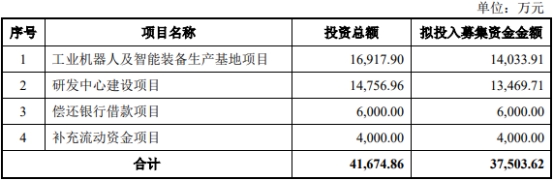 瑞松科技发行新股募集资金总额为4.64亿元,扣除发行费用后,募集资金净额为4.06亿元。瑞松科技最终募集资金净额较原计划多3083.80万元。瑞松科技于2020年2月11日披露的招股说明书显示,公司拟募集资金3.75亿元,分别用于工业机器人及智能装备生产基地项目、研发中心建设项目、偿还银行借款项目、补充流动资金项目。