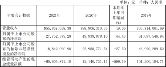 中国经济网北京4月19日讯昨日晚间,瑞松科技(688090.SH)披露了2021年年度报告。2021年,公司实现营业收入9.56亿元,同比增长19.65%;实现归属于上市公司股东的净利润2775.24万元,同比减少44.43%;实现归属于上市公司股东的扣除非经常性损益的净利润1884.21万元,同比减少27.50%;经营活动产生的现金流量净额为-6060.59万元,同比减少599.19%。