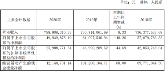 上市当年,瑞松科技净利润下滑。2020年,公司实现营业收入7.99亿元,同比增长9.33%;实现归属于上市公司股东的净利润4993.99万元,同比减少18.26%;实现归属于上市公司股东的扣除非经常性损益的净利润2598.88万元,同比减少44.69%;经营活动产生的现金流量净额为1214.07万元,同比减少88.00%。