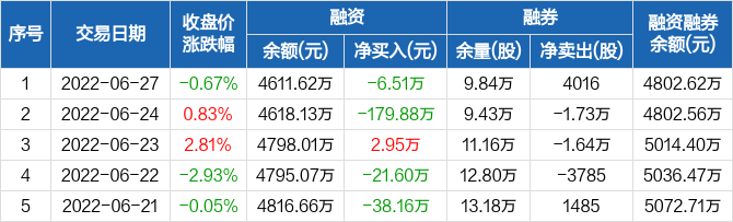 融资方面,当日融资买入62.48万元,融资偿还68.99万元,融资净偿还6.51万元。融券方面,融券卖出4016股,融券偿还0股,融券余量9.84万股,融券余额191.01万元。融资融券余额合计4802.62万元。