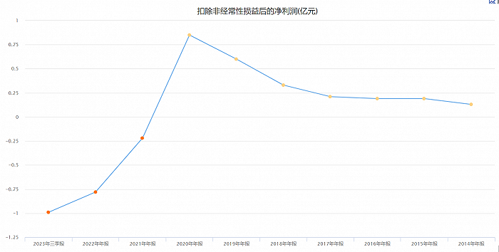 2021年扣非后归母净利亏损0.22亿元,2022年亏损额进一步加大,升至0.78亿元。业绩快报显示,2023年归母净利润亏损0.99亿元,扣非后归母净亏损1.9亿元。