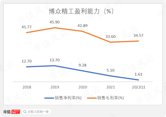 2021年,博众精工的毛利率也因此下滑了近10个百分点至33.6%,净利率仅为5.1%。