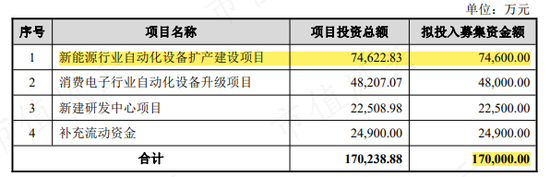 2022年1月,博众精工发布了17亿的定增预案。募资金额最大的项目是“新能源行业自动化设备扩产建设项目”,拟募资7.46亿,其次才是博众精工一直以来的主战场消费电子行业。