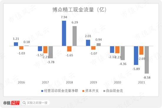 2020年以来,博众精工连续两年经营活动现金流量净额为负,2021年,该金额扩大至-5.89亿。同时,博众精工的自由现金流为-8.58亿,现金流周转压力已迫在眉睫。