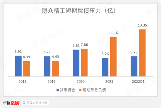 同时,其短期偿债压力也逐渐显现。2021年以来,公司的短期带息负债已经明显超过货币资金,截至2022年3月底,短期带息负债达13.35亿,账面货币资金仅有5.75亿。