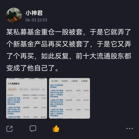 有老铁发帖称,某私募基金重仓一股“被套”,反复加仓后,包揽了该上市公司的前十大流通股东。