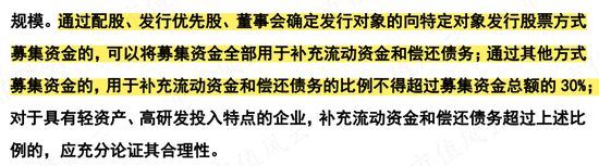根据规定,通过配股、发行优先股、确定发行对象定增募资的,可以将全部募集资金都用来补充流动资金,除此之外的募资方式,用于补流和偿还债务的比例不得超过募资总额的30%。