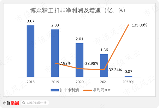 然而,博众精工的扣非净利润却在逐年下滑。2021年,公司实现扣非净利润1.36亿,仅为2019年的一半。