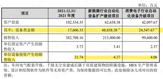 2021年博众精工现有设备的单位投资产值达21.74万,然而,拟募资建设的新能源和消费电子项目,其单位投资产值仅有4万元左右。这也呼应了上文毛利率的持续下滑。