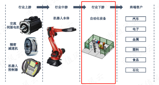 博众精工的自动化设备业务,位于智能装备制造业的下游,即公司根据下游客户需求,向上游、中游采购核心零部件以及机械手臂等,自主生产自动化设备,向汽车、电子、金属、石化等领域的终端客户实现销售。