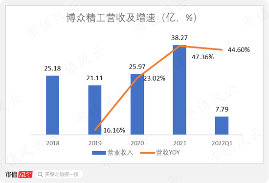 2021年,博众精工实现营收38.27亿,同比增长47.36%,似乎打破了此前营收增长停滞的局面。2021年一季度,博众精工营收为7.79亿,同比增上升44.6%,继续保持增长。