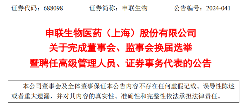 2024年12月24日,申联生物发布关于完成董事会、监事会换届选举暨聘任高级管理人员、证券事务代表等多个公告。