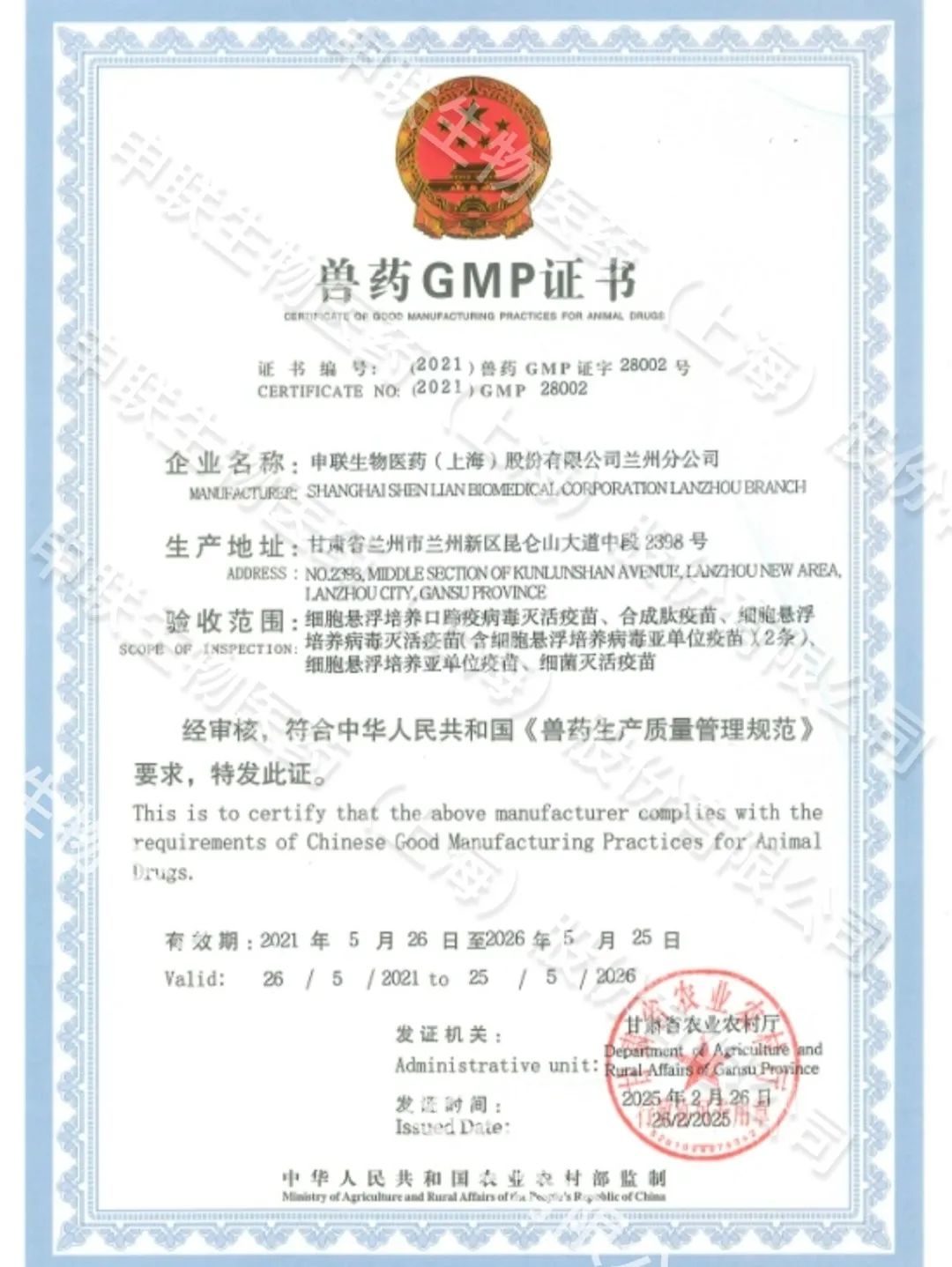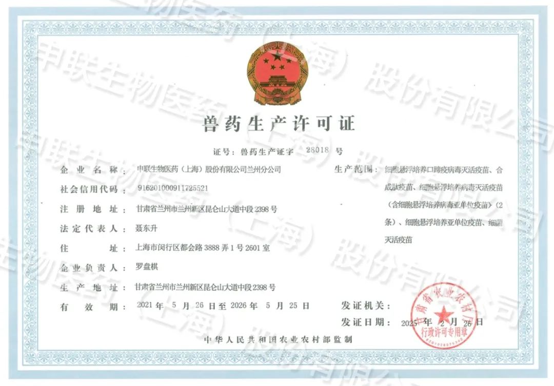 2025年2月26日,申联生物医药(上海)股份有限公司兰州分公司取得甘肃省畜牧兽医局新核发的《兽药GMP证书》和《兽药生产许可证》。
