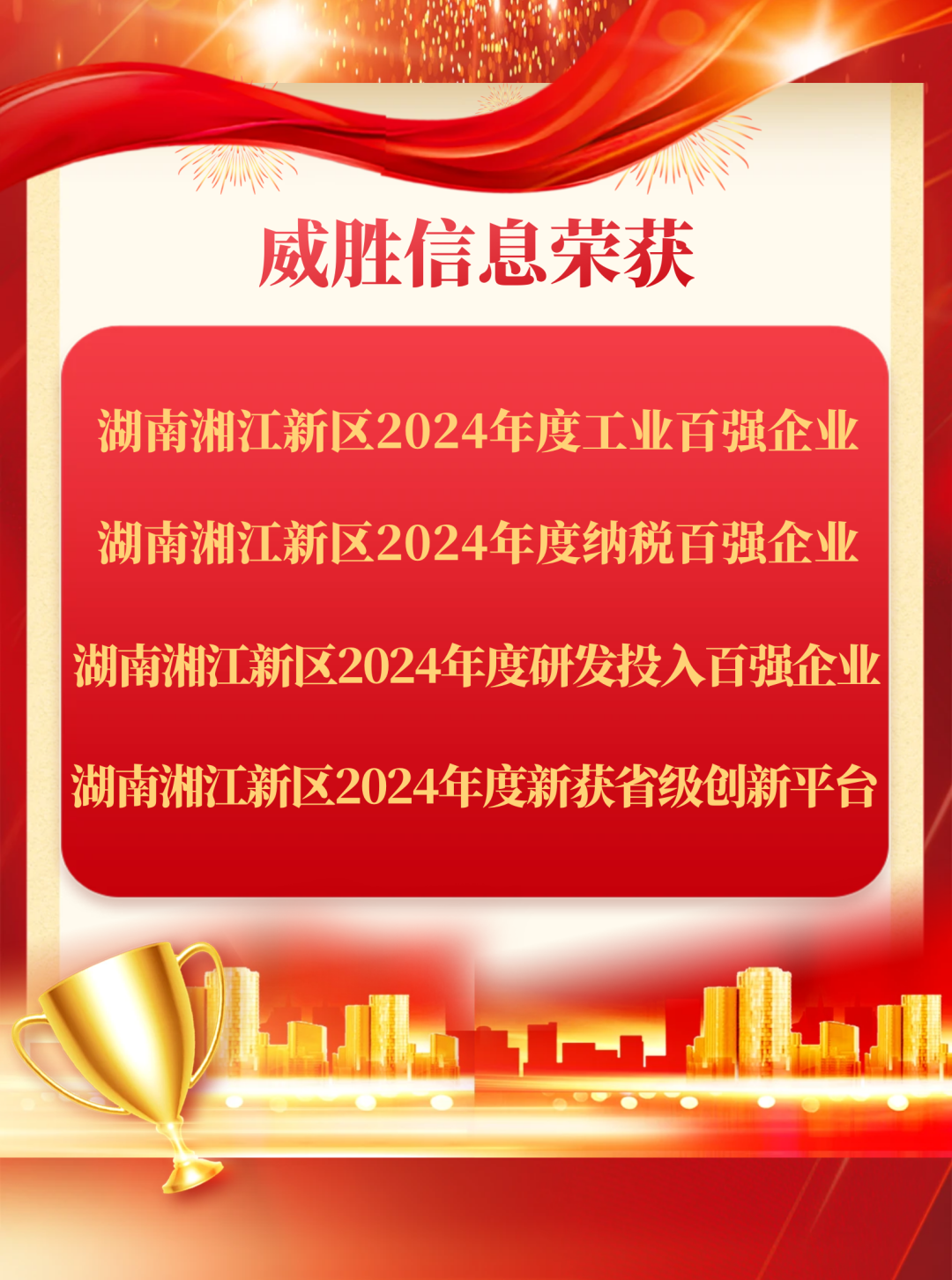 大会宣读了《关于发布湖南湘江新区2024年度推进高质量发展工作优秀企业和单位名单的通知》。威胜信息荣获“湖南湘江新区2024年度工业百强企业”、“湖南湘江新区2024年度纳税百强企业”、“湖南湘江新区2024年度研发投入百强企业”、“湖南湘江新区2024年度新获省级创新平台”四大奖项。