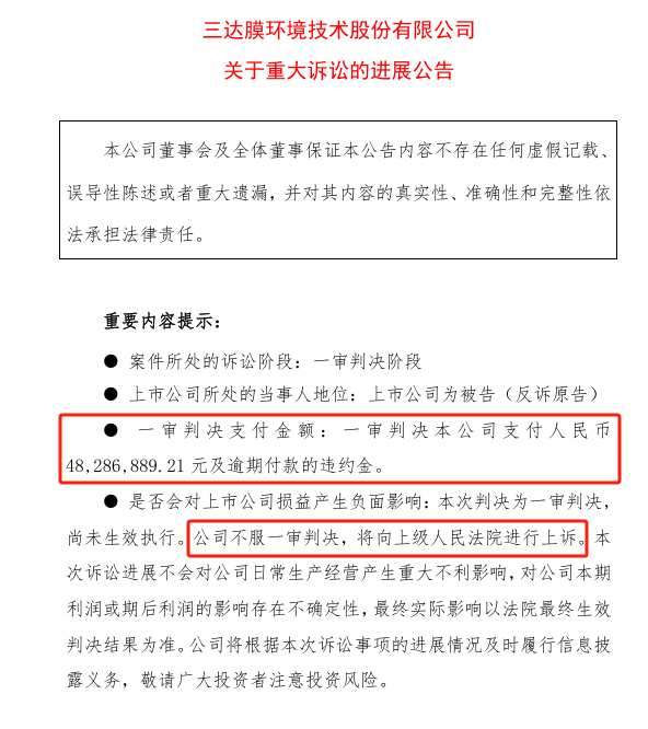 面对这一结果,三达膜表示,一审判决尚未生效,将在收到判决书后的十五日内向上级法院提起上诉,并强调此次诉讼暂不会对公司日常经营产生重大不利影响,但对利润的影响仍存在不确定性,最终结果将以法院生效判决为准。
