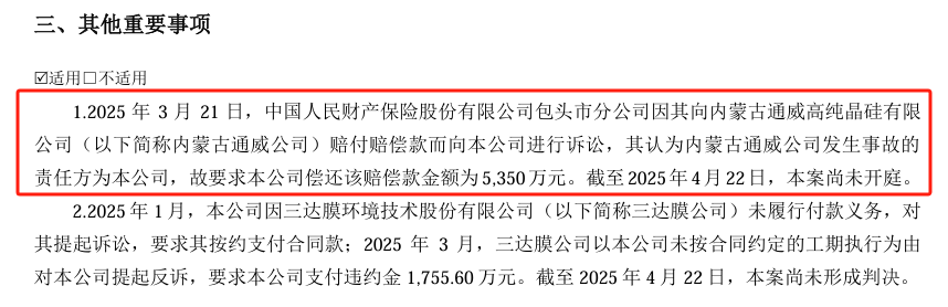 起因是该保险公司向内蒙古通威高纯晶硅有限公司赔付赔偿款后,认定内蒙古通威公司发生事故的责任方为蓝晓科技,因此要求蓝晓科技偿还5350万元赔偿款。截至2025年4月22日,这起诉讼案件尚未开庭。
