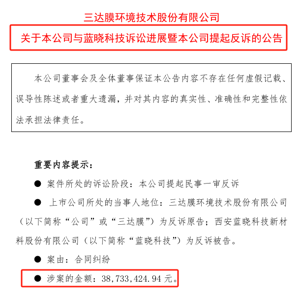 面对诉讼压力,三达膜也并未示弱,对蓝晓科技提起了反诉,诉求涉及工期延期违约金、设备更换等,反诉金额合计约3873万元。