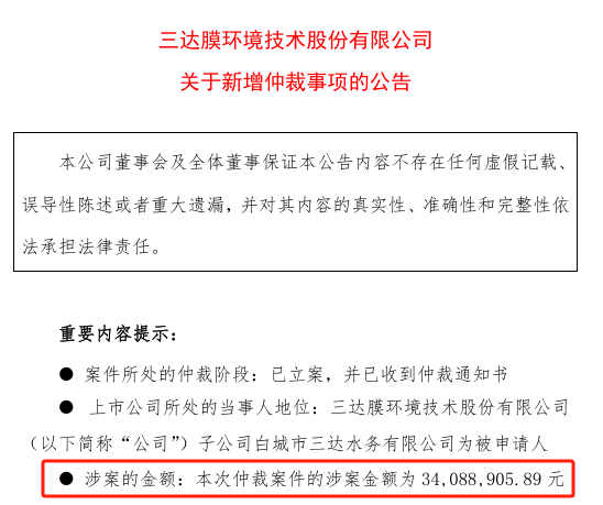 3月18日,三达膜发布公告称新增一则仲裁事项,其子公司白城市三达水务有限公司因工程施工合同纠纷被吉林省安基建筑集团有限公司(简称“安基建筑”)申请仲裁,涉案金额为3409万元。仲裁原因依旧是合同双方在付款条件是否达成上存在争议。