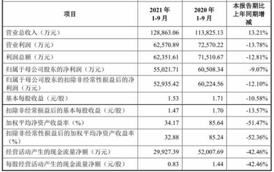 上市公告书显示,2021年1-9月,诺唯赞实现营业收入12.89亿元,较去年同期上升13.21%;实现归属于母公司股东的净利润5.50亿元,较去年同期下降9.07%;实现扣除非经常性损益后归属于母公司股东的净利润5.29亿元,较去年同期下降12.10%;经营活动产生的现金流量净额为2.99亿元,较去年同期下降42.46%。