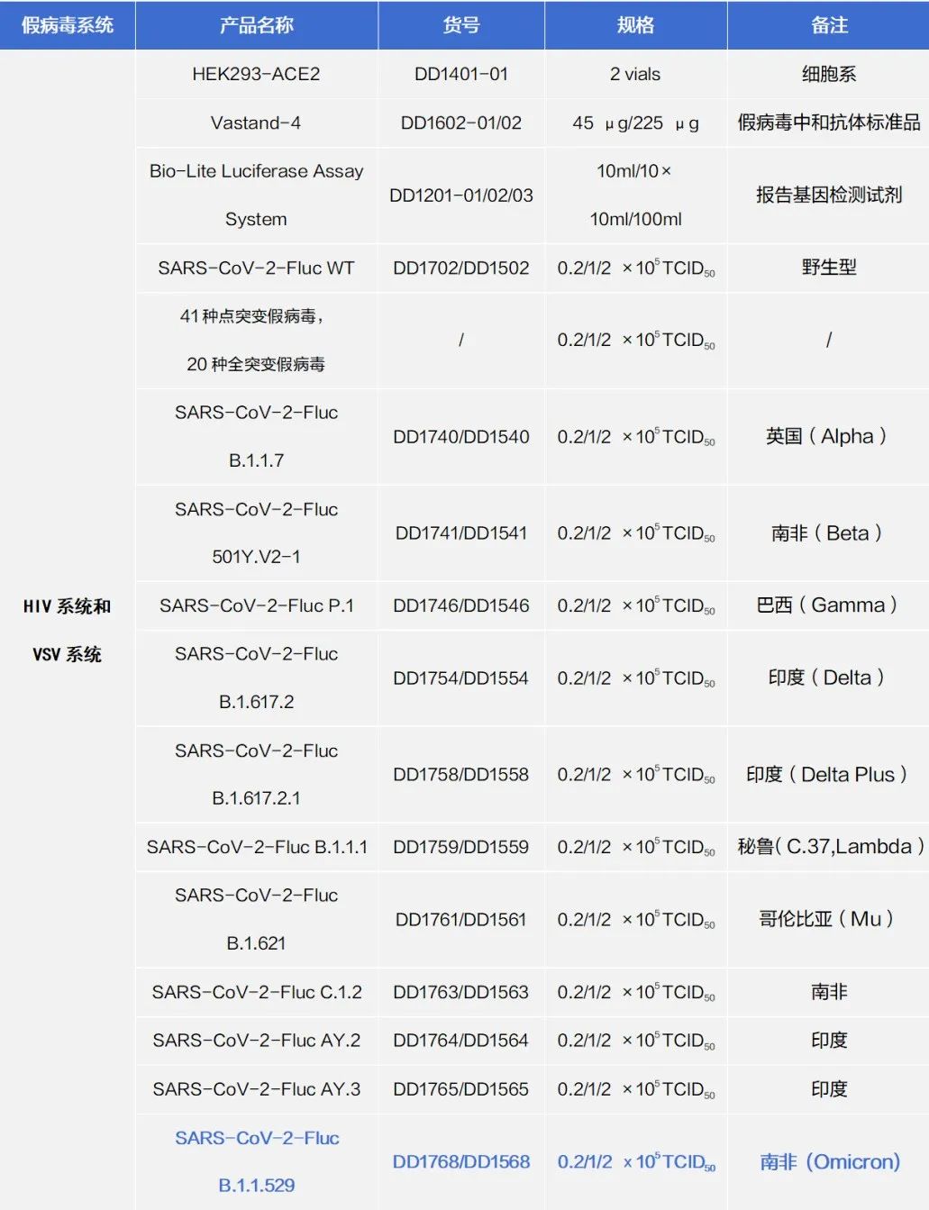 针对病毒突变株研究,诺唯赞分秒必争,研发团队迅速上新Omicron突变株HIV和VSV系统假病毒(见表1),协助科研人员快速评价新冠疫苗和抗体药物对Omicron的保护效果。数量有限,先到先得!