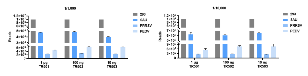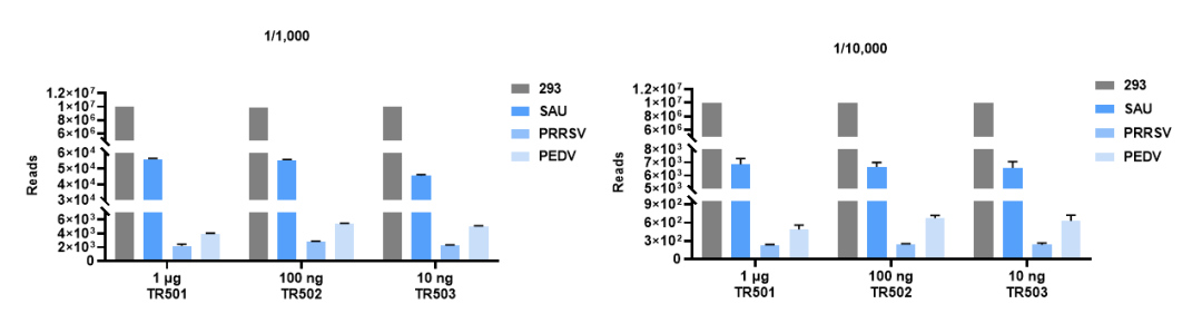 Vazyme #TR501/502/503构建出的微生物RNA文库在FASTASeq 300与NovaSeq 6000测序平台的下机数据质量优秀,均能有效检出占比低至1/10,000的微生物RNA。