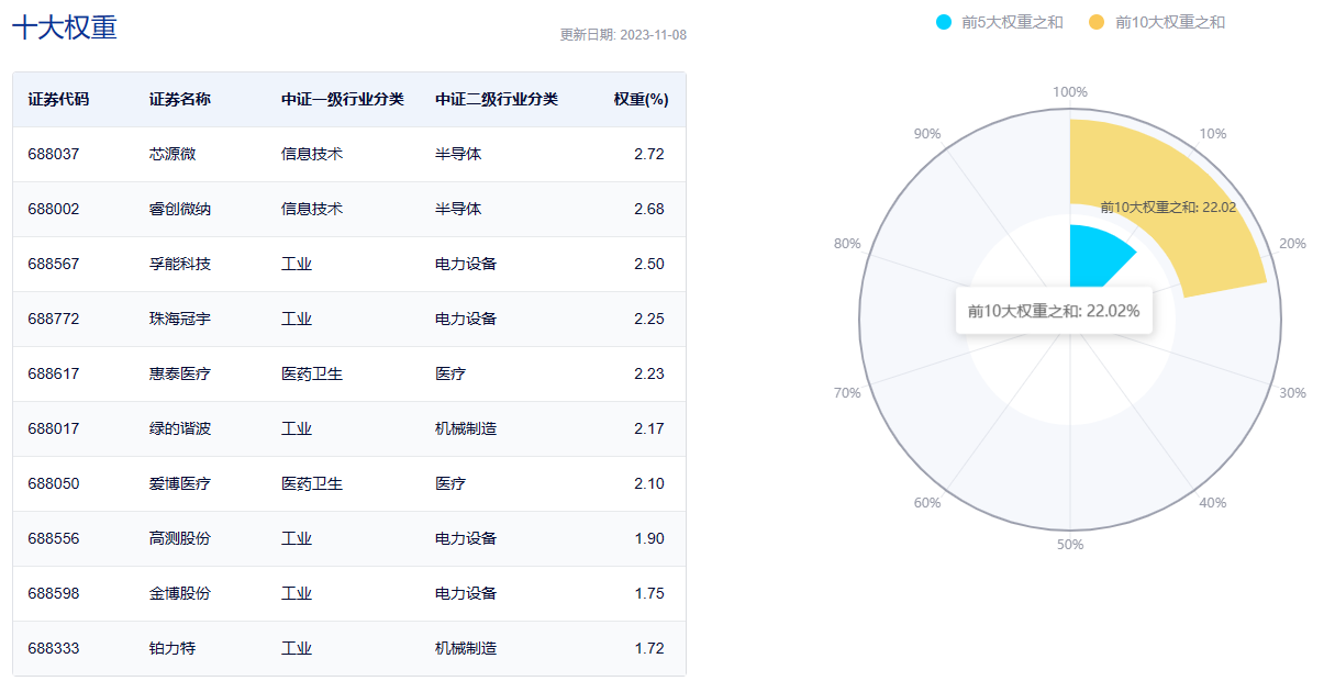 数据显示,截至2023年11月8日,该指数前十大权重股包括芯源微、睿创微纳、孚能科技、珠海冠宇、惠泰医疗等,前十大权重股合计占比约为22.02%。(数据来源:中证指数公司,指数成份股不代表个股推荐)
