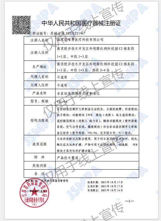 近日,诺唯赞推出的全自动基因测序文库制备仪VNL-96通过江苏省药品监督管理局审批,获得医疗器械注册证(注册证编号:苏械注准20232221447),助力精准医学和临床诊断等领域实现基因测序文库自动化构建。