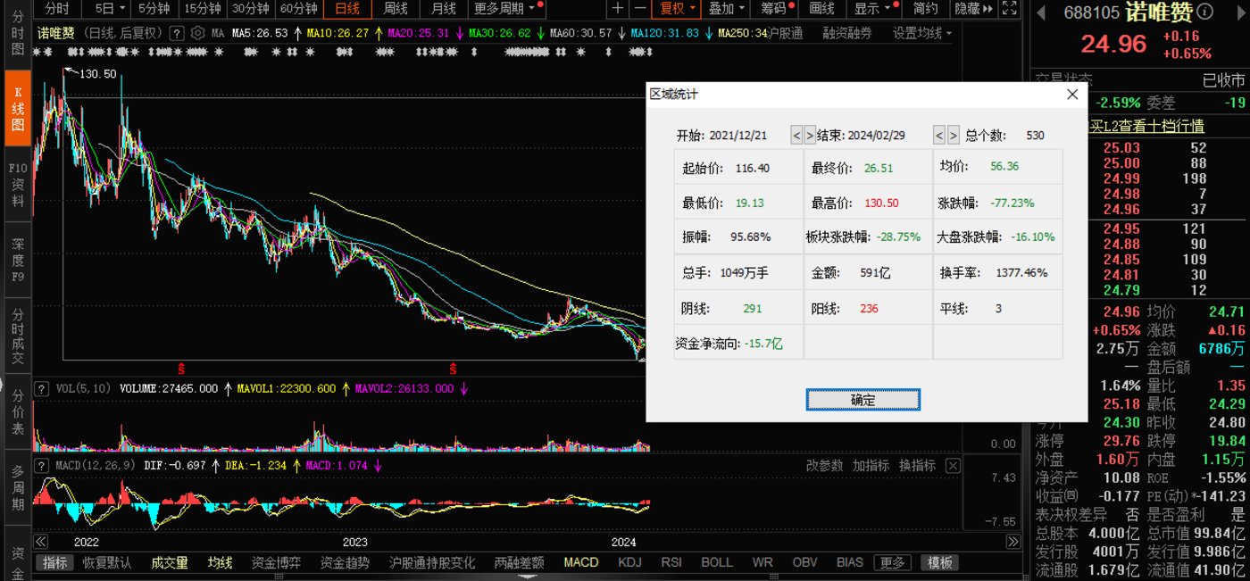 二级市场方面,2月29日诺唯赞股价微涨0.65%,收24.96元,暂时未受到业绩利空影响。但拉长时间看,维诺赞股价一路波动下行。诺唯赞首发价格为55元,2021年12月22日股价一度突破130.5元的历史高点。以后复权形式计算,诺唯赞最新股价已较历史高点跌去七成之多,最新市值不足百亿。