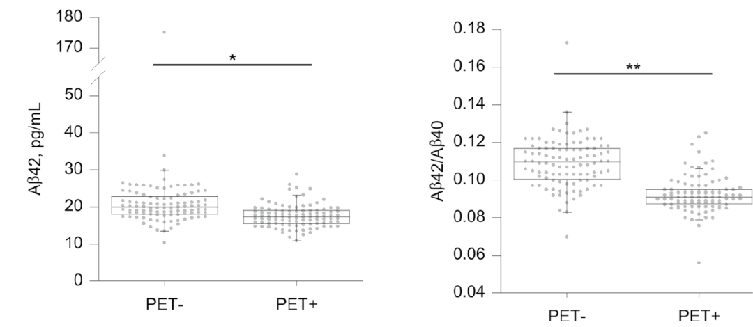 图3 PET检测阴阳性时Aβ42脑脊液丰度(左)、PET检测阴阳性时Aβ42/Aβ40比值分布图(右)