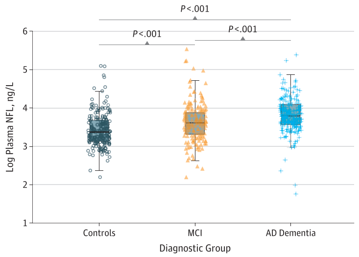 图5 血浆NfL在正常人群、轻度认知障碍、AD痴呆患者中的丰度
