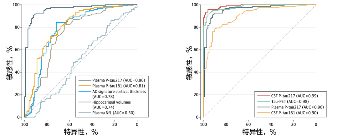 图4 血浆中不同标志物检测对AD痴呆的敏感度与特异性(左)、不同类型标本中标志物对AD痴呆的敏感度与特异性(右)