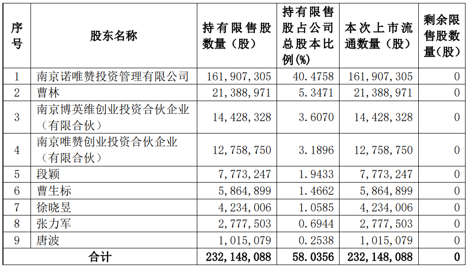 今日,诺唯赞(688105.SH)有232,148,088股的首发限售股份上市流通,占公司总股本的58.0356%,涉及9名股东。