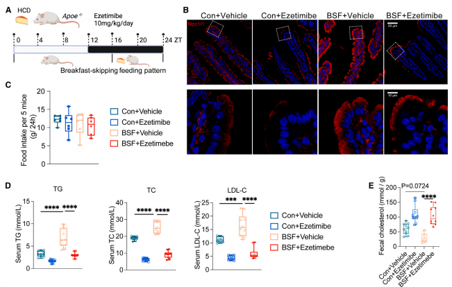 研究通过设计自动控制小鼠进食时间的装置,模拟人类不规律饮食模式,特别是早餐跳过(BSF)的情况,结合转录组、表观遗传学和代谢组等探究不规律饮食如何影响小肠的脂质吸收和全身代谢稳态。结果发现,BSF模式下,小肠上皮细胞中关键胆固醇转运蛋白NPC1L1表达增加,即使在恢复正常饮食模式后,经历过BSF模式的小鼠仍然保持了脂质过吸收的状态,意味着不规律饮食模式可以引起持久的代谢适应。长期BSF模式的小鼠表现出血清中总胆固醇和甘油三酯水平的增加,以及粪胆固醇的减少,提示系统代谢稳态受到损害(图3)。