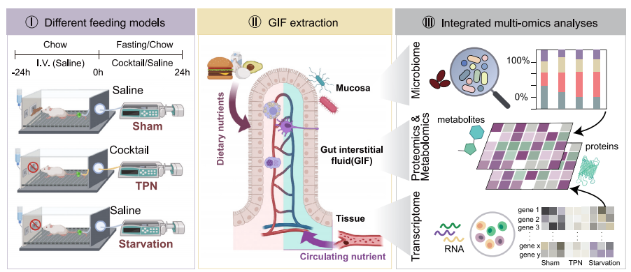 小肠是人体吸收营养的核心部位,具有双重营养供给环境,包括外源饮食摄入和微生物来源的代谢物(肠腔侧营养)以及经血管供给小肠的宿主系统代谢物(腹膜侧营养)。然而,不同营养供给途径如何具体影响小肠功能,科学界尚缺乏系统研究。