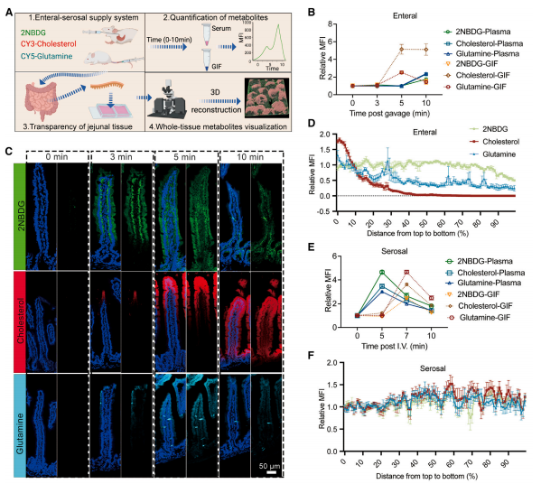 为了进一步探究小肠对营养物质的吸收机制,研究通过荧光示踪技术和体内成像揭示了小肠对葡萄糖、胆固醇和谷氨酰胺等营养物质吸收的时空特性。结果显示肠腔侧营养物质吸收呈现特定的时空动态,而腹膜侧营养物质吸收则无明显区域或细胞特异性(图2)。