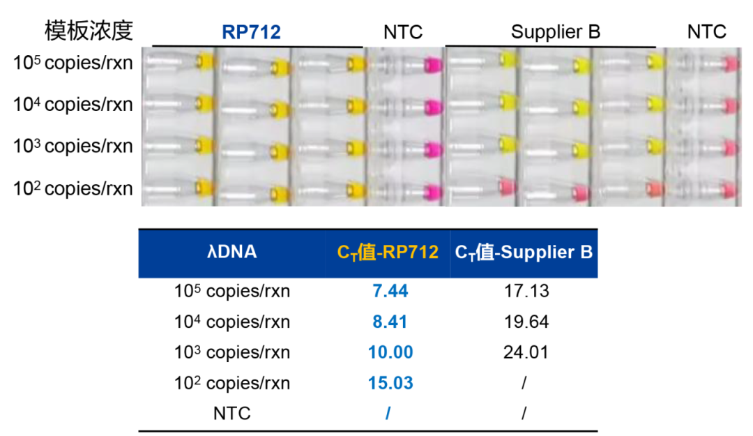 图3. Vazyme #RP712与市售同类型产品LAMP扩增(以DNA为模板)性能测试结果对比