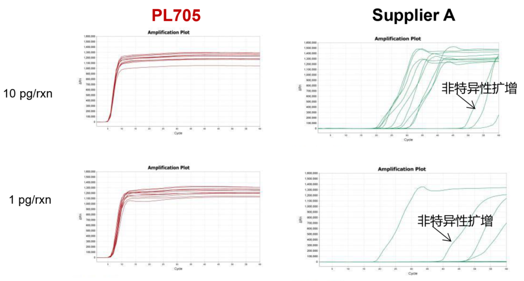 以金黄色葡萄球菌gDNA为模板,在较低模板浓度条件下进行LAMP扩增,对比不同体系低模板检出数量和扩增时间。Vazyme #PL705对低浓度模板的检出成功率更高,灵敏度更高,检出时间更短,且扩增特异性更好。