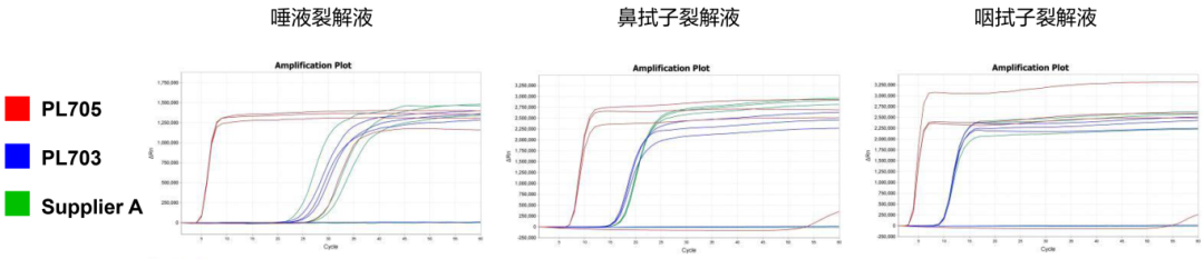 使用Vazyme #PL705、PL703和市售同类型产品Supplier A对唾液裂解液、鼻拭子裂解液和咽拭子裂解液(Vazyme #P073裂解)进行LAMP扩增反应,结果显示,PL705能够耐受唾液、鼻拭子、咽拭子裂解液,耐杂性好,同时扩增速度显著快于PL703和Supplier A。