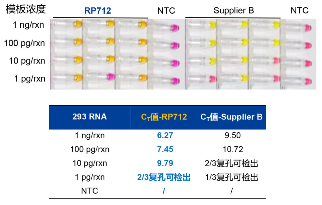 兼容DNA和RNA模板,扩增阴性结果显示红色,阳性显示黄色,结果颜色对比鲜明,便于观察,无需复杂仪器分析,检测一步到位,同时Vazyme #RP712扩增速度更快(CT值更小),灵敏度优于Supplier B。