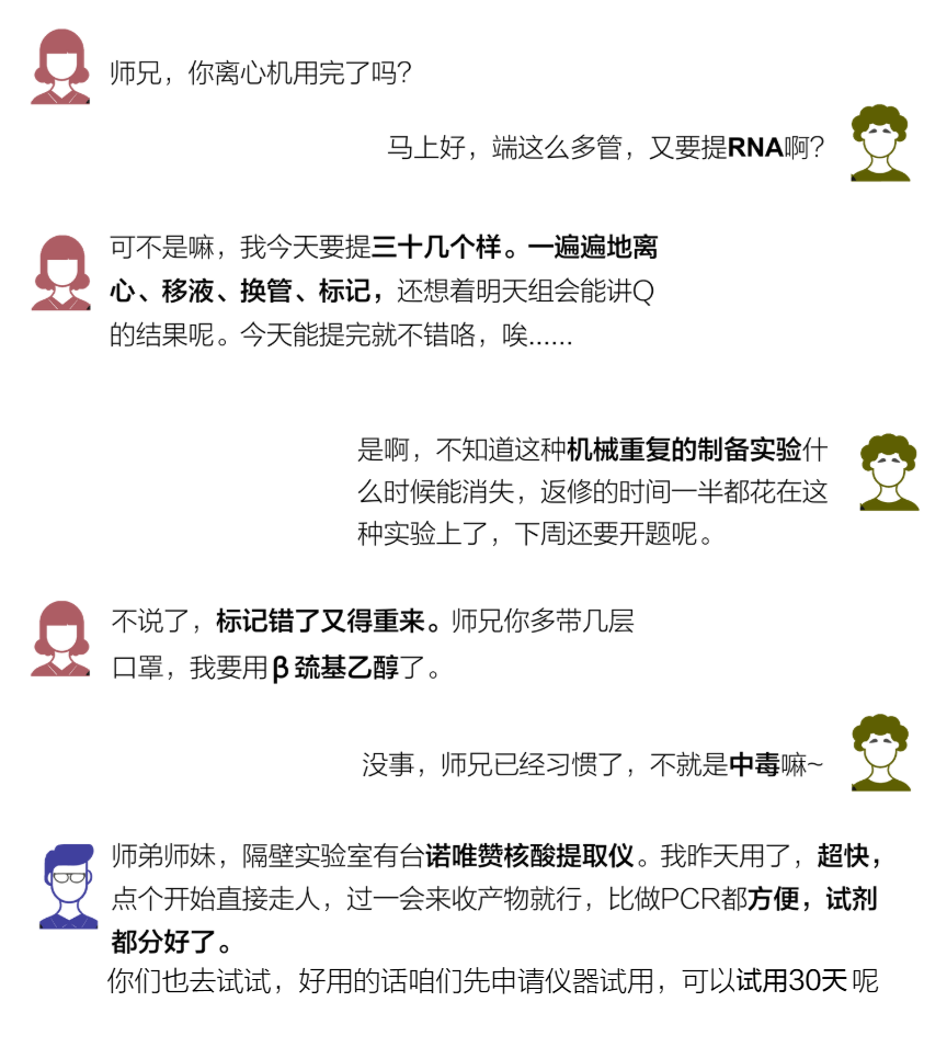 被试剂熏出痛苦面具、来不及提取又担心冻融使RNA降解、一遍遍地往返于实验台与离心机之间、离心的十分钟不知道做点什么、分层的手微微颤抖、找沉淀找到看管子有重影、qPCR趋势像加密盲盒,忙了一上午也不知道都忙了什么......