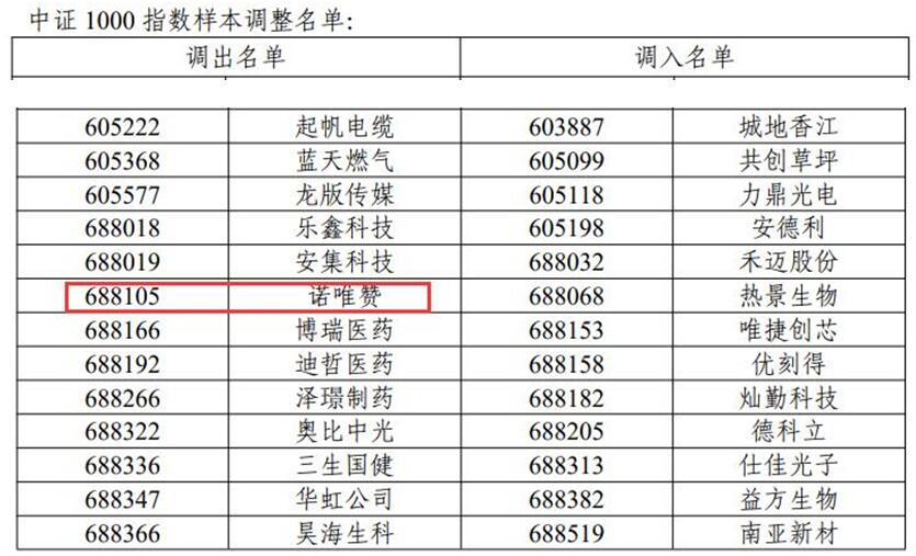 调整结果显示, 诺唯赞 (688105.SH)被调出中证1000指数样本。