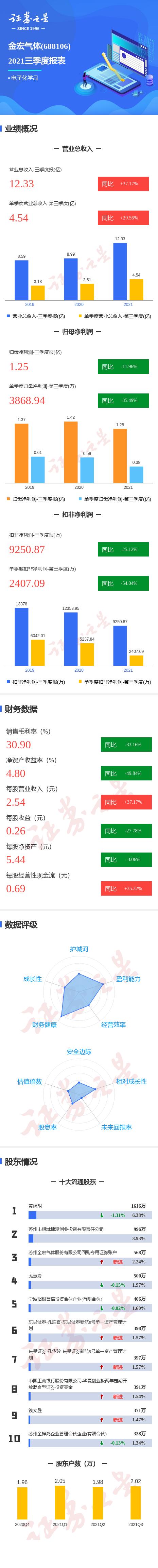 金宏气体2021三季报显示,公司主营收入12.34亿元,同比上升37.17%;归母净利润1.26亿元,同比下降11.96%;扣非净利润9250.88万元,同比下降25.12%;其中2021年第三季度,公司单季度主营收入4.55亿元,同比上升29.56%;单季度归母净利润3868.95万元,同比下降35.49%;单季度扣非净利润2407.1万元,同比下降54.04%;负债率32.38%,投资收益795.05万元,财务费用-715.78万元,毛利率30.9%。