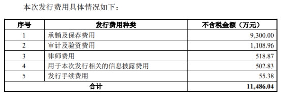 金宏气体发行费用合计人民币11,486.04万元(不含可以抵扣的进项税),其中招商证券股份有限公司获得承销及保荐费用9,300.00万元。