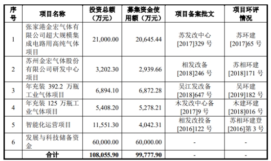 金宏气体发行新股募集资金总额为187,437.10万元,扣除发行费用后募集资金净额为人民币175,951.06万元。金宏气体最终募集资金净额较原计划多76173.16万元。金宏气体2020年6月11日发布的招股说明书显示,公司计划募集资金99,777.90万元,分别用于张家港金宏气体有限公司超大规模集成电路用高纯气体项目、苏州金宏气体股份有限公司研发中心项目、年充装392.2万瓶工业气体项目、年充装125万瓶工业气体项目、智能化运营项目、发展与科技储备资金。
